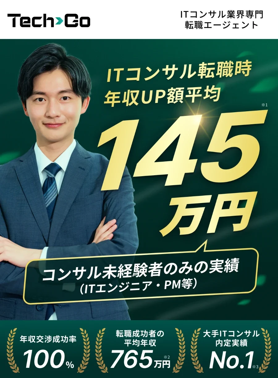 テックゴーは外資系コンサルBIG4から、ホワイトITコンサルまで国内に展開する200社以上のITコンサル求人の紹介が可能。