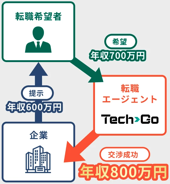 また、テックゴーは選考対策によるオファー年収のUPだけでなく、その後の年収交渉において100%の成功実績を誇っています。これまでの支援では、年収が200万円アップしたケースも多数。